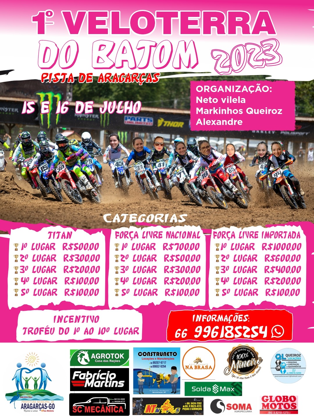 No sábado, 15, e domingo, 16, as emoções ficam por conta das mulheres que acelerarão forte no primeiro Veloterra do Batom, que terá sábado o esquenta, com as provas oficiais acontecendo no domingo a partir das 9h. “Essa prova só é possível, graças ao incentivo dado pelo prefeito Ricardo Galvão, desde a construção da pista no Jardim Novo Mundo, como a logística disponibilizada”, disse o organizador Thiago Reis.