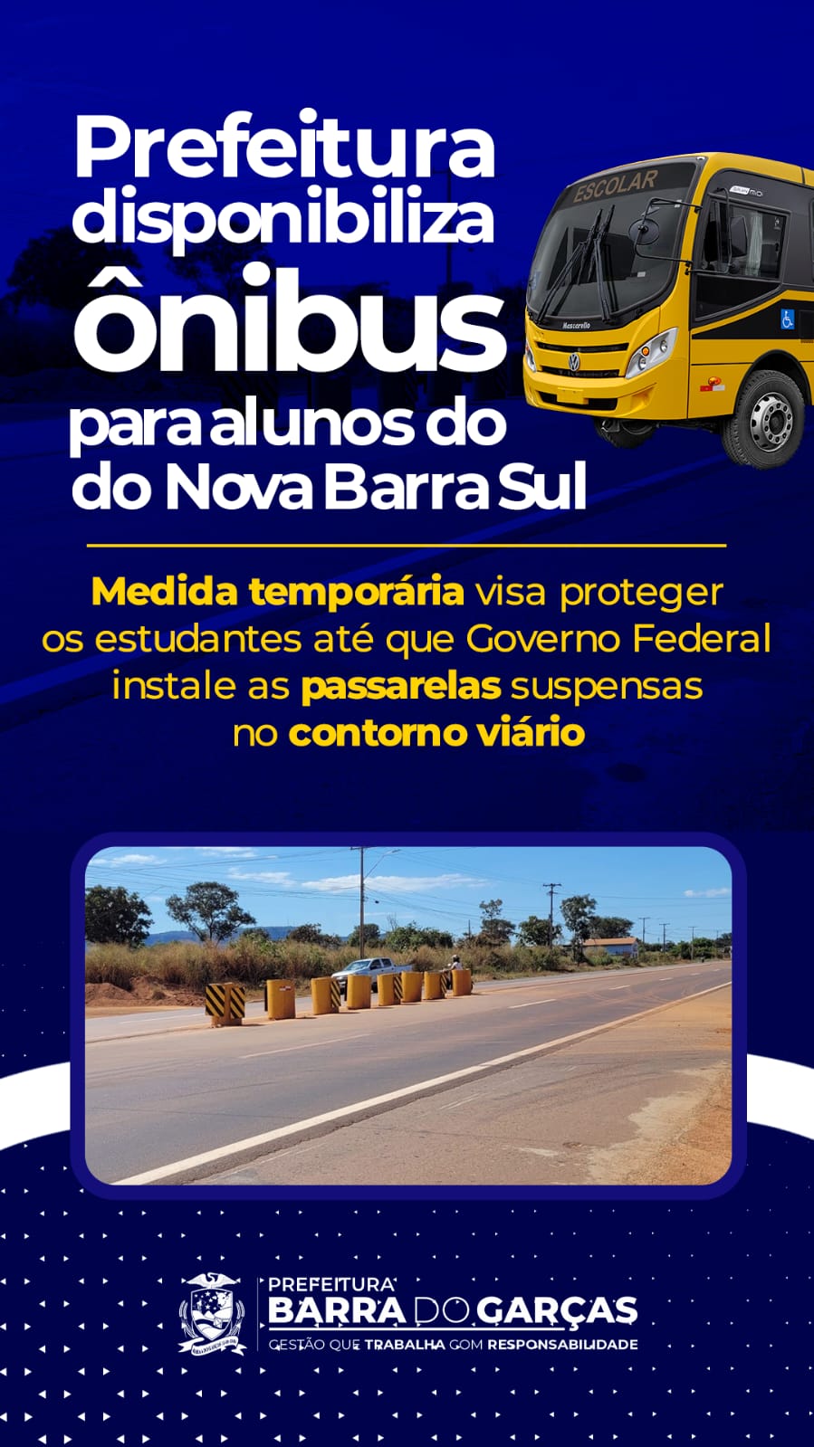 A partir da próxima segunda-feira (21), a Secretaria Municipal de Educação de Barra do Garças disponibilizará um ônibus exclusivo para o transporte dos alunos da CMEB Helena Esteves e da creche Maurenice que moram no setor Nova Barra Sul, que foram prejudicados pela construção de uma barreira de proteção na construção do contorno viário feito pelo Governo Federal. No momento está sendo realizado um levantamento dos alunos que necessitam de transporte no CMEB Frederico Toscani. A medida temporária foi anunciada pelo prefeito Dr. Adilson, nesta quarta-feira (16), segundo ele, a cessão do ônibus visa proteger os estudantes até que as passarelas de pedestres sejam instaladas definitivamente. “A população não pode ser prejudicada por uma obra que ainda não foi finalizada”, afirmou o prefeito.