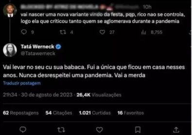 “Vai nascer uma nova variante vindo da festa, rico não se controla, logo ela que criticou tanto quem se aglomerava durante a pandemia”. Em seguida, Tatá rebateu:
