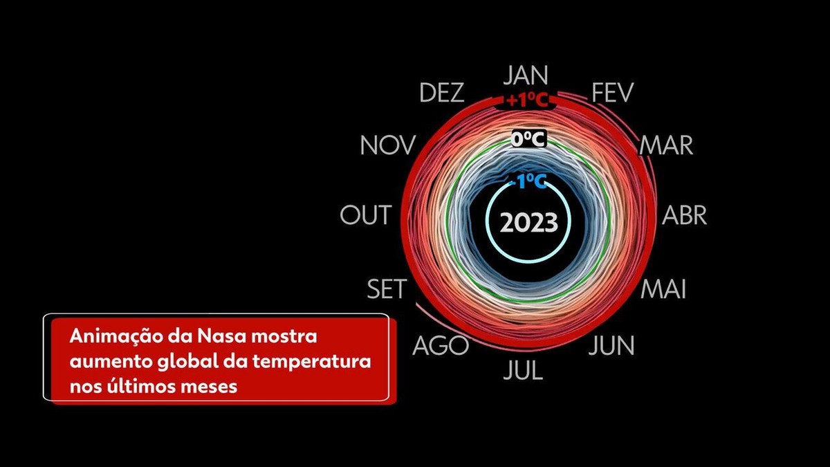 Nela é possível ver que as cores vão ficando mais fortes nas últimas décadas, período em que o aquecimento global se acelera, se aproxima e passa, nos últimos anos, de 1ºC (em relação a 1880) e que, quando a espiral chega ao mês de setembro de 2023, o mais quente da história da Terra, a linha circular se distancia bastante da marca de 0ºC.