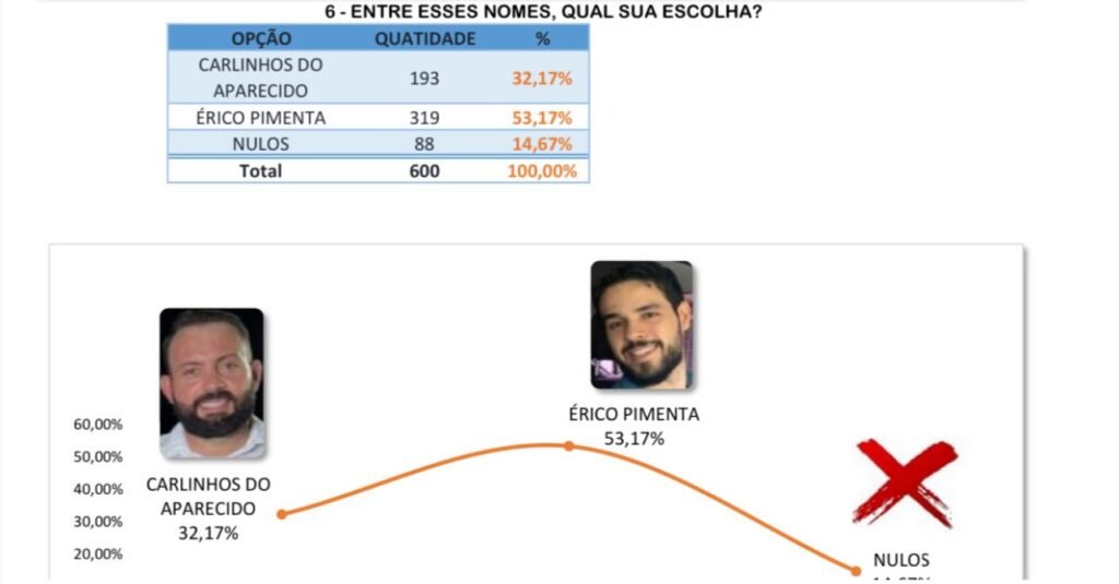 O líder da corrida eleitoral é Érico Pimenta, com expressivos 52,5% das intenções de voto, seguido por Carlinhos Aparecido, em segundo lugar, com 24,83%. A diferença percentual entre o primeiro e o segundo colocado é de 27,67%.