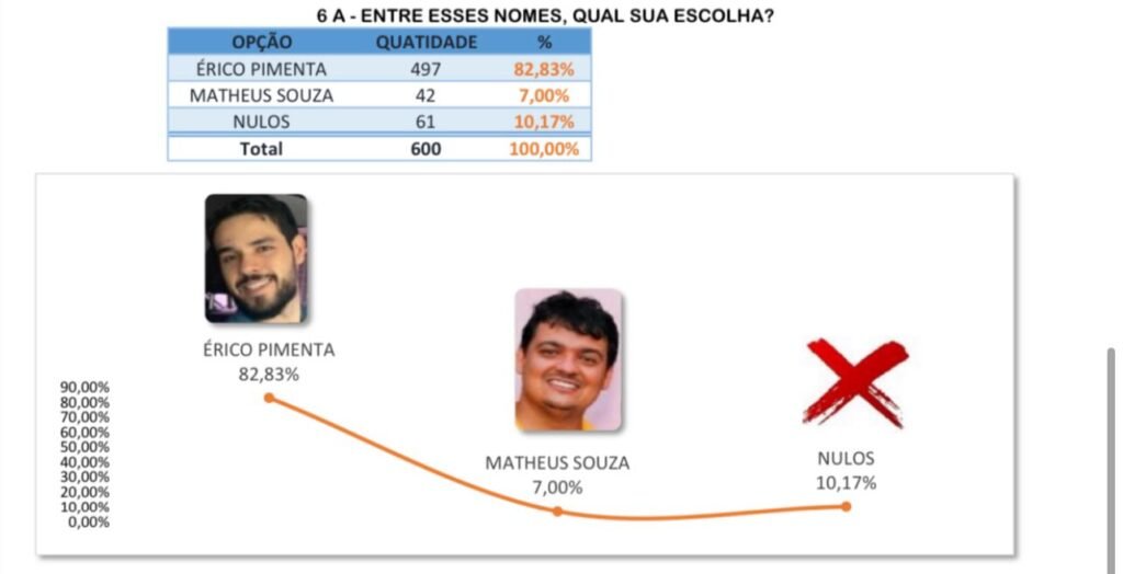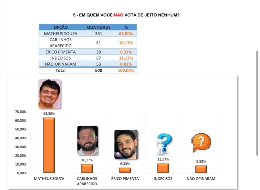 Quanto à rejeição dos candidatos, Matheus Souza lidera com 63,5%, seguido por Carlinhos do Aparecido com 10,17%. Érico Pimenta com apenas 6,33%.