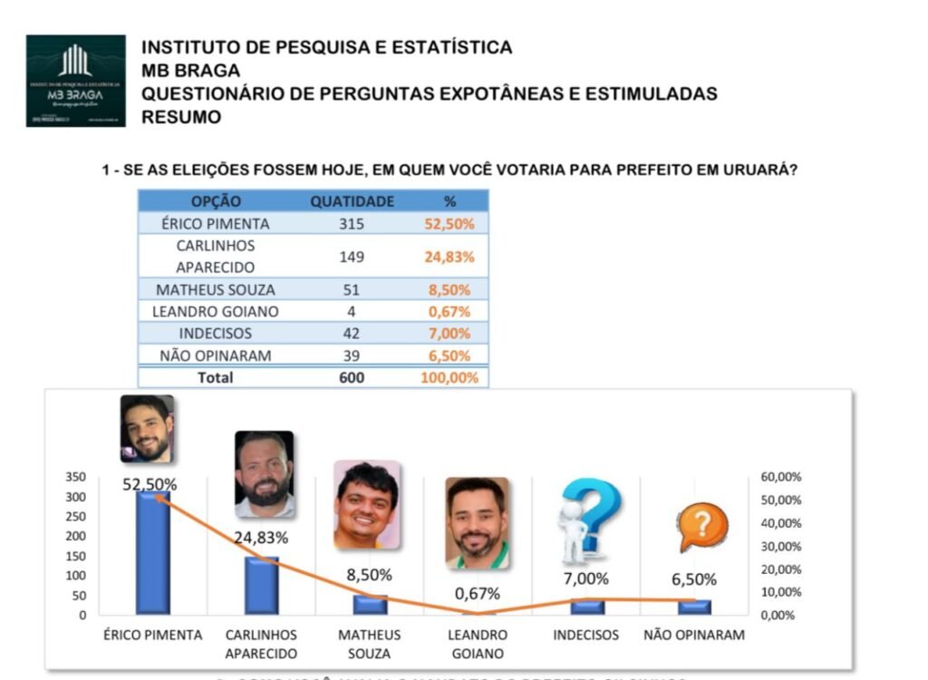 Essa pesquisa revela uma dinâmica interessante na política local de Uruará-Pará. Érico Pimenta lidera na intenção de votos, seguido por Carlinhos Aparecido e Matheus Souza. A rejeição parece ser um desafio para Matheus Souza, enquanto Érico Pimenta parece ter uma posição mais consolidada, especialmente em confronto direto com outros candidatos. Os resultados sugerem um cenário que pode influenciar estratégias de campanha e alianças.