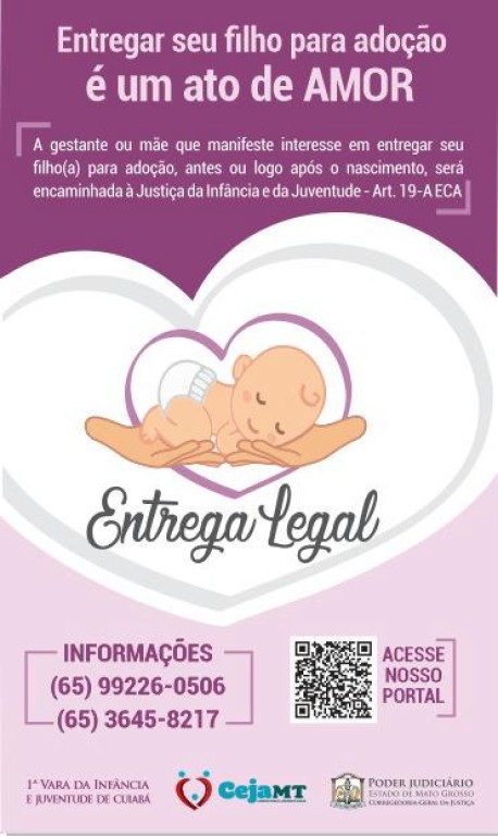 O projeto Entrega Legal é uma campanha permanente da Corregedoria-Geral da Justiça (CGJ) e do Tribunal de Justiça de Mato Grosso (TJMT), que promove a garantia de atendimento da gestante ou parturiente que manifeste interesse em entregar o (a) filho (a) para adoção, mediante seu encaminhamento à Justiça da Infância e da Juventude, evitando assim o abandono de crianças e a prática de adoção irregular.