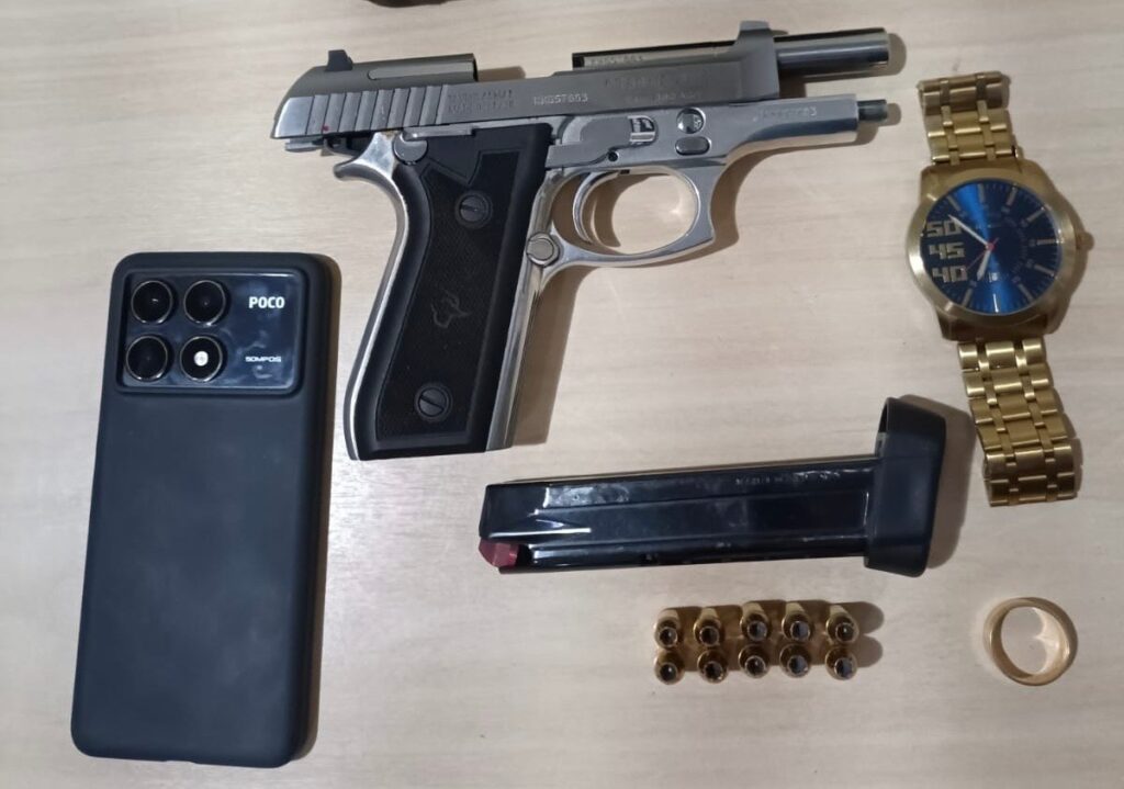 Nesse momento, foi abordada uma caminhonete Hilux. Durante a vistoria, foi encontrado um armamento no interior do veículo: uma pistola Taurus PT58, calibre .380, com 10 munições intactas.