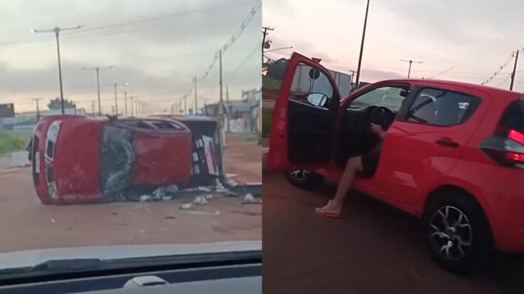 Segundo informações, o veículo Fiat Mobi estava trafegando na rotatória quando foi atingido por uma caminhonete Mitsubishi Triton de cor vermelha. Com o impacto, a caminhonete capotou a alguns metros do local da colisão. No veículo foi possível observar algumas latinhas de cervejas.