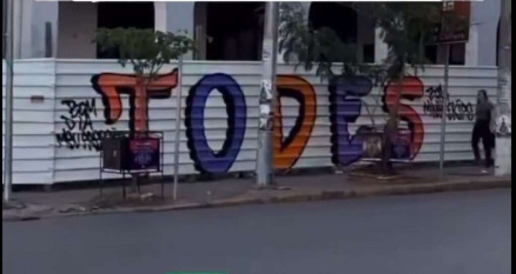 A Prefeitura de Cuiabá apagou a pichação “todes” feita em um tapume próximo ao Palácio Alencastro. Em suas redes sociais, o prefeito Abilio Brunini (PL) compartilhou a imagem da pichação feita nesta terça-feira (12) e do tapume já sem a expressão nesta quarta (13).
