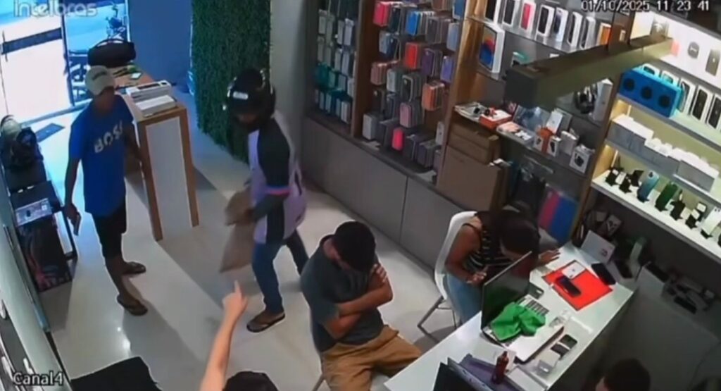 O crime aconteceu por volta das 11h22 e foi registrado por uma câmera de segurança do estabelecimento comercial (veja o vídeo acima). As imagens mostram que havia dois clientes e dois funcionários na loja quando um dos assaltantes, usando um boné, entra no local fingindo querer comprar alguma coisa.