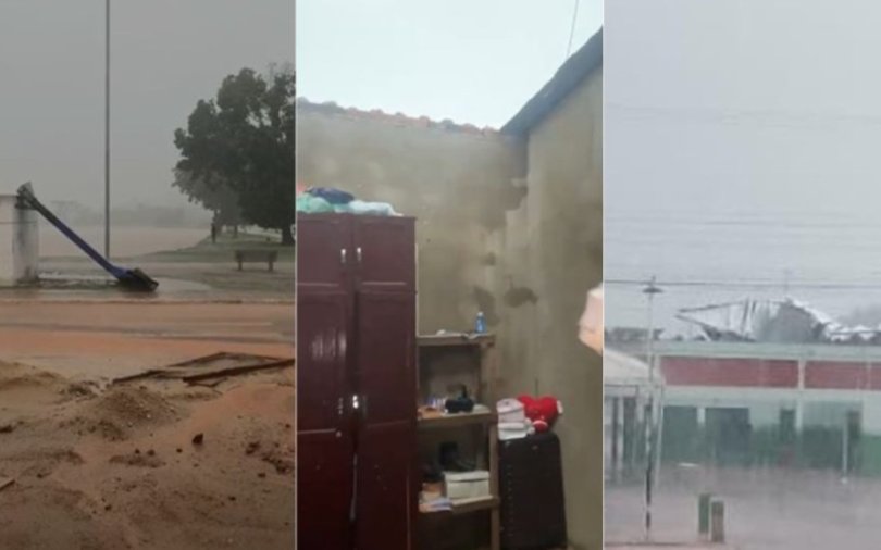 Nas imagens, é possível ver capacetes sendo arrastados pela enxurrada, postes tombados e carros atingidos por galhos. Parte das tendas instaladas no estacionamento da Prefeitura foi destruída, e a água chegou a invadir o prédio público.