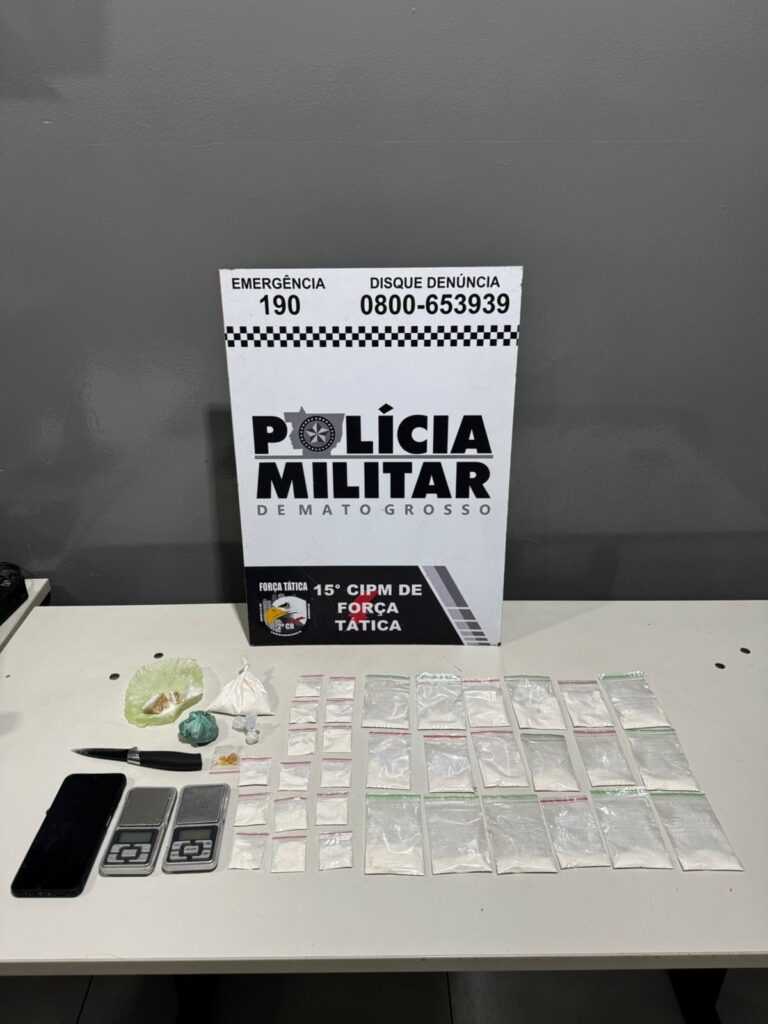 Uma ação rápida da equipe Força 90 resultou na detenção de um suspeito por tráfico de drogas no bairro São Mateus, em Várzea Grande, após denúncias de que um homem estaria comercializando entorpecentes no estacionamento de um mercado da região.
