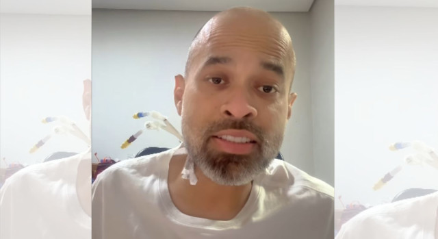 Ainda com um cateter no pescoço, o humorista agradeceu pela campanha de doação de sangue que foi realizada em prol dele e ainda brincou: “Resultado: sem um rim, sem um coco, sem cabelo”.