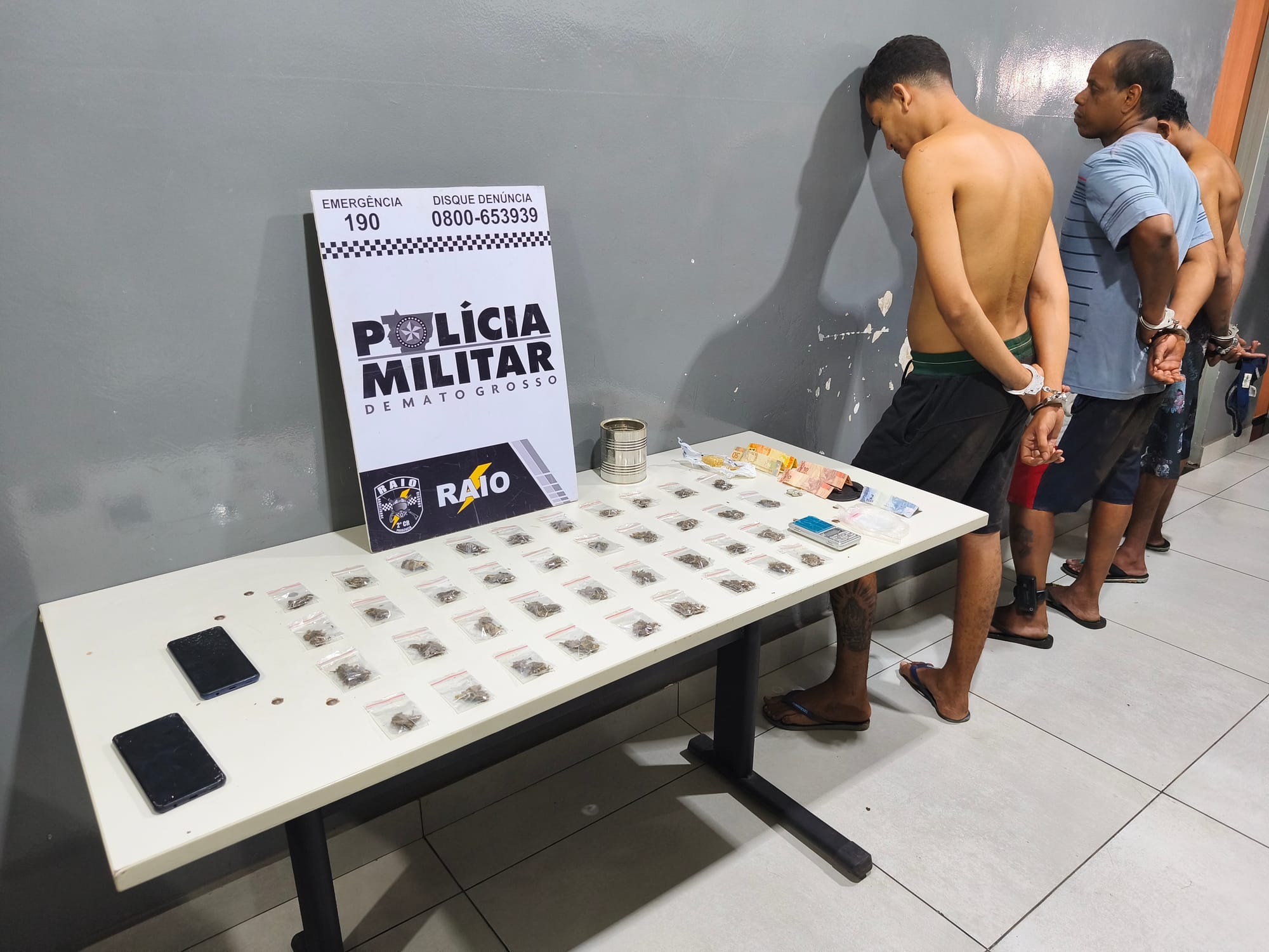 Durante entrevista, os três abordados confessaram que atuavam na venda de entorpecentes na região. Diante do flagrante, receberam voz de prisão e foram encaminhados, algemados, à Central de Flagrantes para as providências cabíveis, sendo apresentados à Polícia Civil sem lesões corporais.