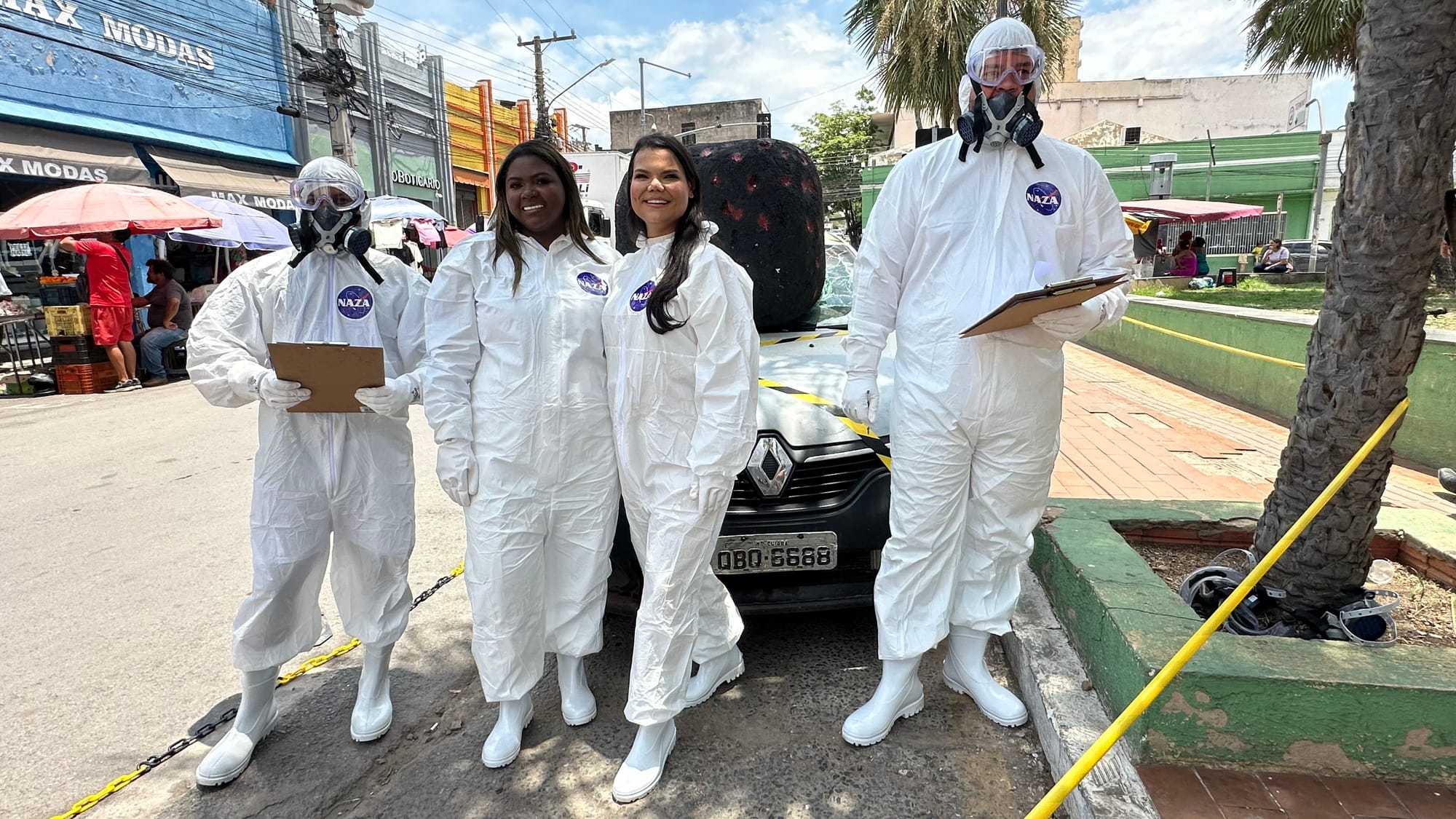 As empresárias amigas, responsáveis pelo Bazar das Amigas, decidiram apostar em uma estratégia diferente para divulgar o evento e criaram uma cena digna de filme: um carro com o vidro completamente estilhaçado, muita fumaça saindo do veículo, efeitos especiais simulando um meteoro preso no para-brisa e até astronautas da NASA circulando em volta da gravação.