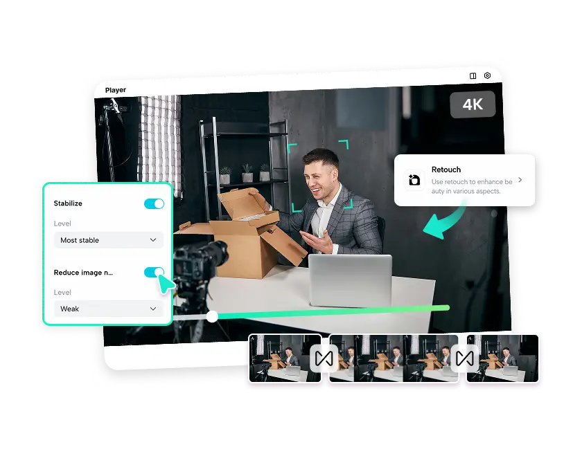 O editor de vídeo com IA ajusta automaticamente luzes, matizes e o tom geral do vídeo de acordo com seu pedido. Ele organiza o ritmo, as transições e os aprimoramentos, deixando seu vídeo com aspecto profissional.