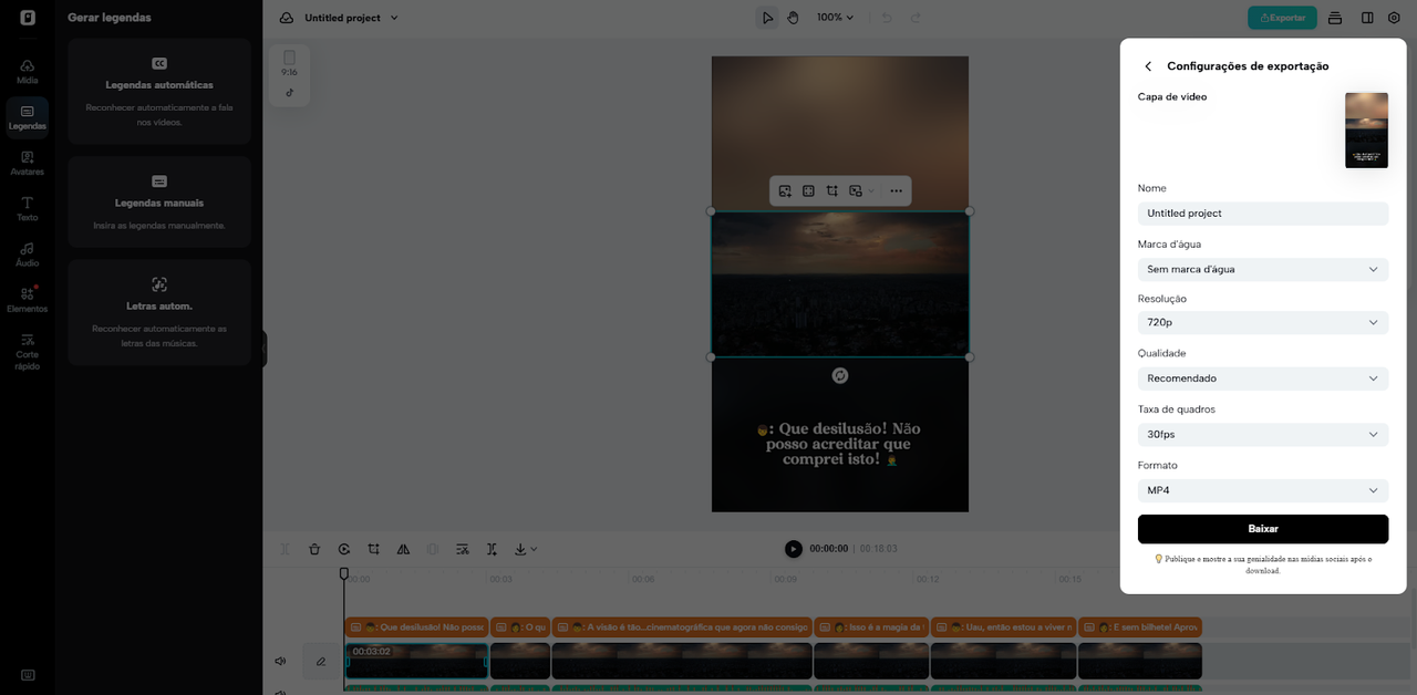 Quando estiver pronto, clique em “Exportar” para salvar, “Publicar” para compartilhar nas redes sociais ou “Baixar” para armazenar o vídeo com as configurações personalizadas.