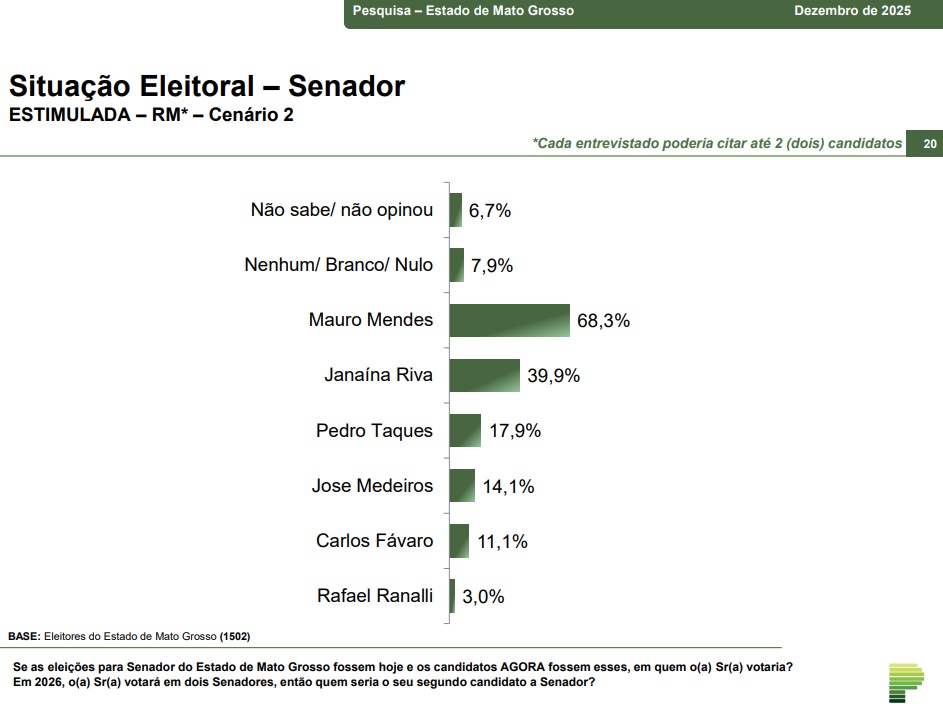 Após os dois favoritos, Taques tem 17,9%; Medeiros é o indicado por 14,1%; o ministro e senador licenciado Fávaro vem com 11,1%. Seguido pelo vereador de Cuiabá Rafael Ranalli (PL) com 3,0%.